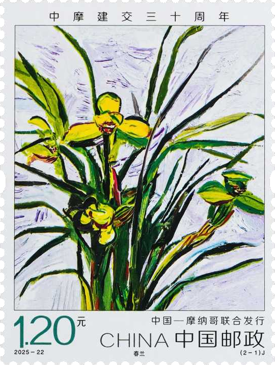 本套邮票分别选用具有两国民族特色和深厚文化内涵的花卉,中国选用栽培历史悠久的春兰,摩纳哥选用美丽灵动的风铃草,两种花卉彰显出生态文明的内在价值与精神追求。邮票图案采用油画表现方式,设计师通过大胆的构图、恣意的笔触、灵活的色彩搭配,对具体的物象进行抽象提炼,从而营造出一种生动而富有生命力的画面效果。两枚邮票承载着“友谊长存”的深层寓意,希望中摩关系不断取得新进展,更好造福两国人民。