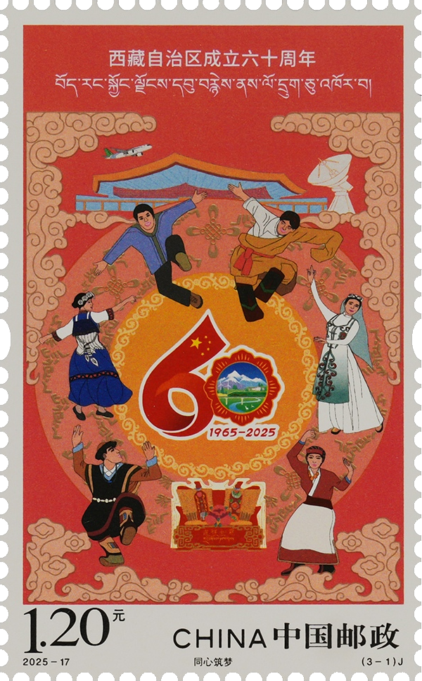 邮票图案融合藏派绘画的民族特色与现代装饰画的构成艺术语言,色彩绚丽、气势宏大、节奏明快,展现出在新时代党的治藏方略引领下,西藏各族人民携手共进、同心同行,各项事业取得全方位进步、历史性成就,各族群众获得感、幸福感、安全感不断提升。